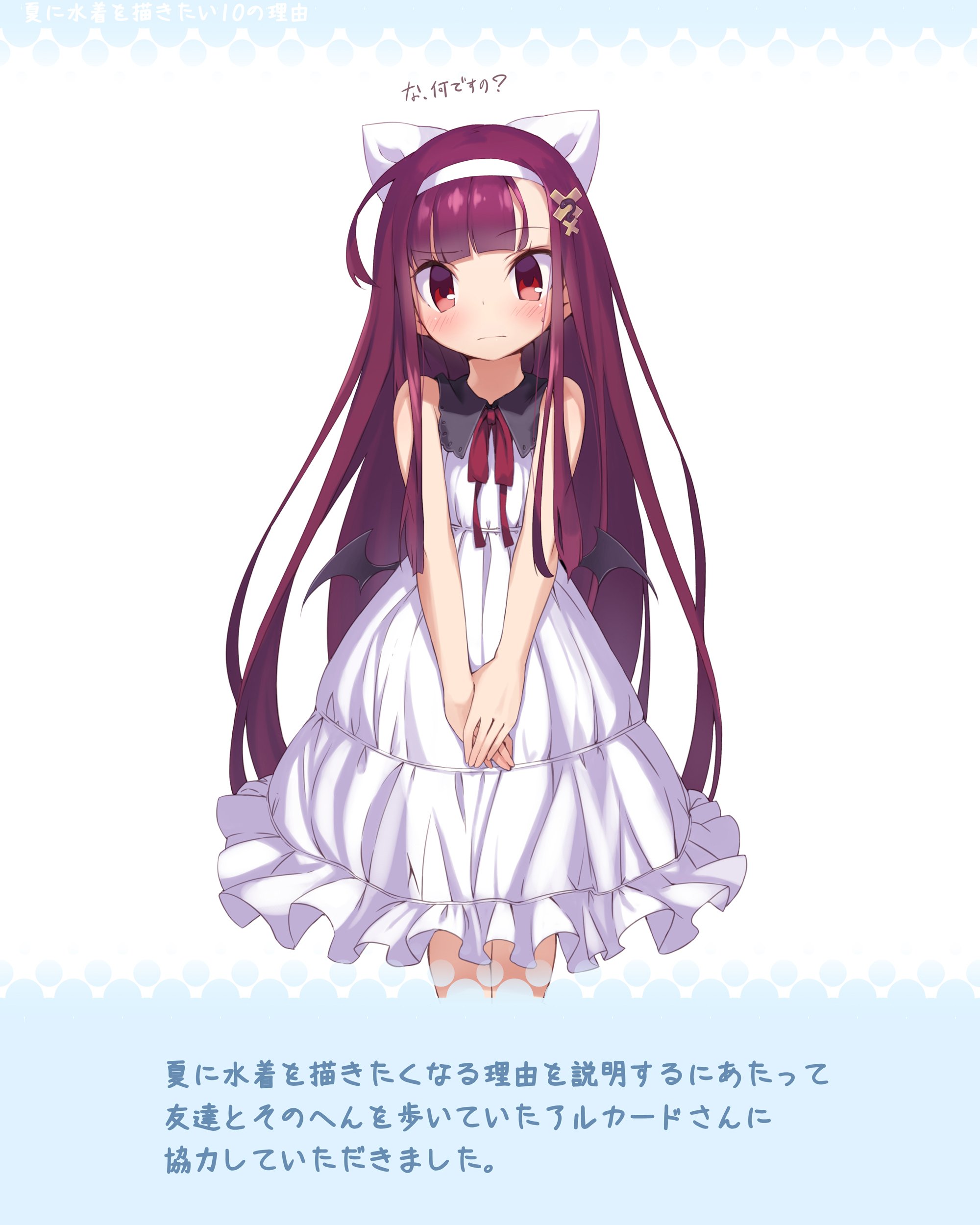 1girlalternate costumebare shouldersbat wingsblack collarblack wingscollardressforeheadfrilled dressfrillshair ribbonhairbandlong hairneck ribbonpurple hairred eyesred ribbonribbonsleevelesssleeveless dresssolowhite backgroundwhite dresswhite hairbandwhite ribbonwings