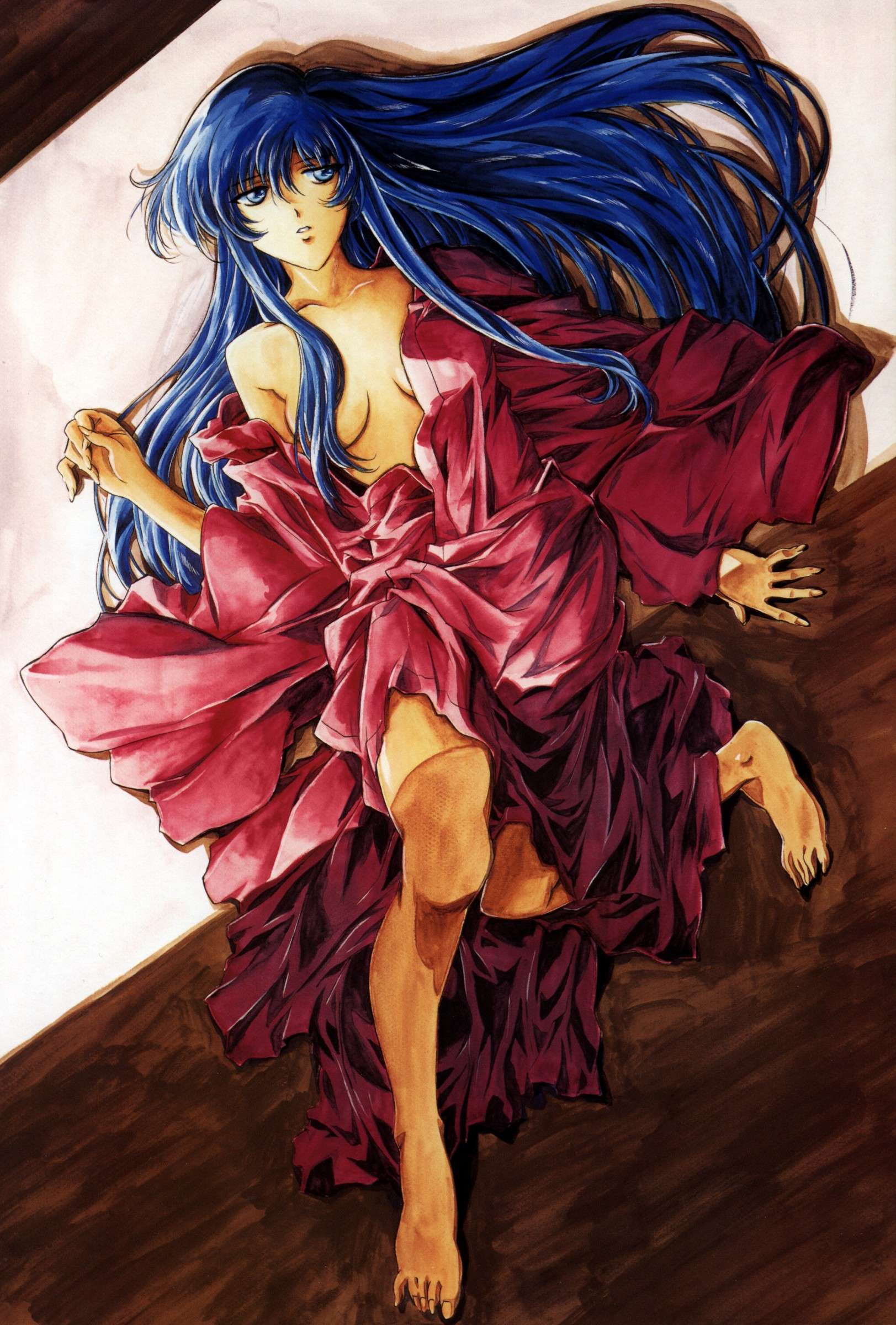 1990s (style)1girlbare shouldersbarefootblue hairbreastscensoredcleavageconvenient censoringfeetfemale focushair censorhair over breastsjapanese clotheskimonolong hairlyingmedium breastson backretro artstylesolo