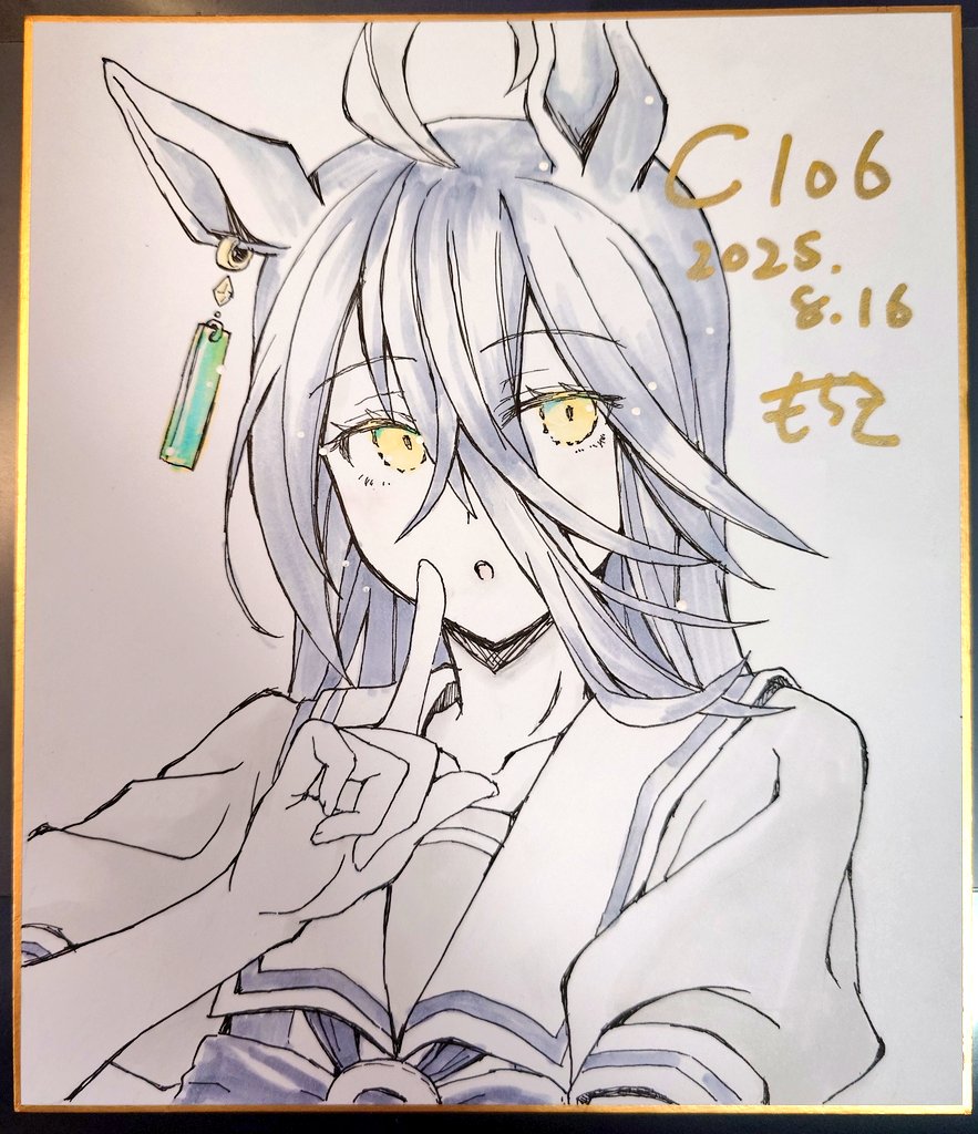 ahogeanimal earsartist namebowbowtiecrossed bangsdatedear ornamentear tagearringsfinger to mouthhair between eyeshorse earshorse girlindex finger raisedjewelrylong hairlong hair between eyesmulticolored hairpuffy short sleevespuffy sleevessailor collarschool uniformshort sleevesshushingsignaturesingle earringspot colortracen school uniformyellow eyes