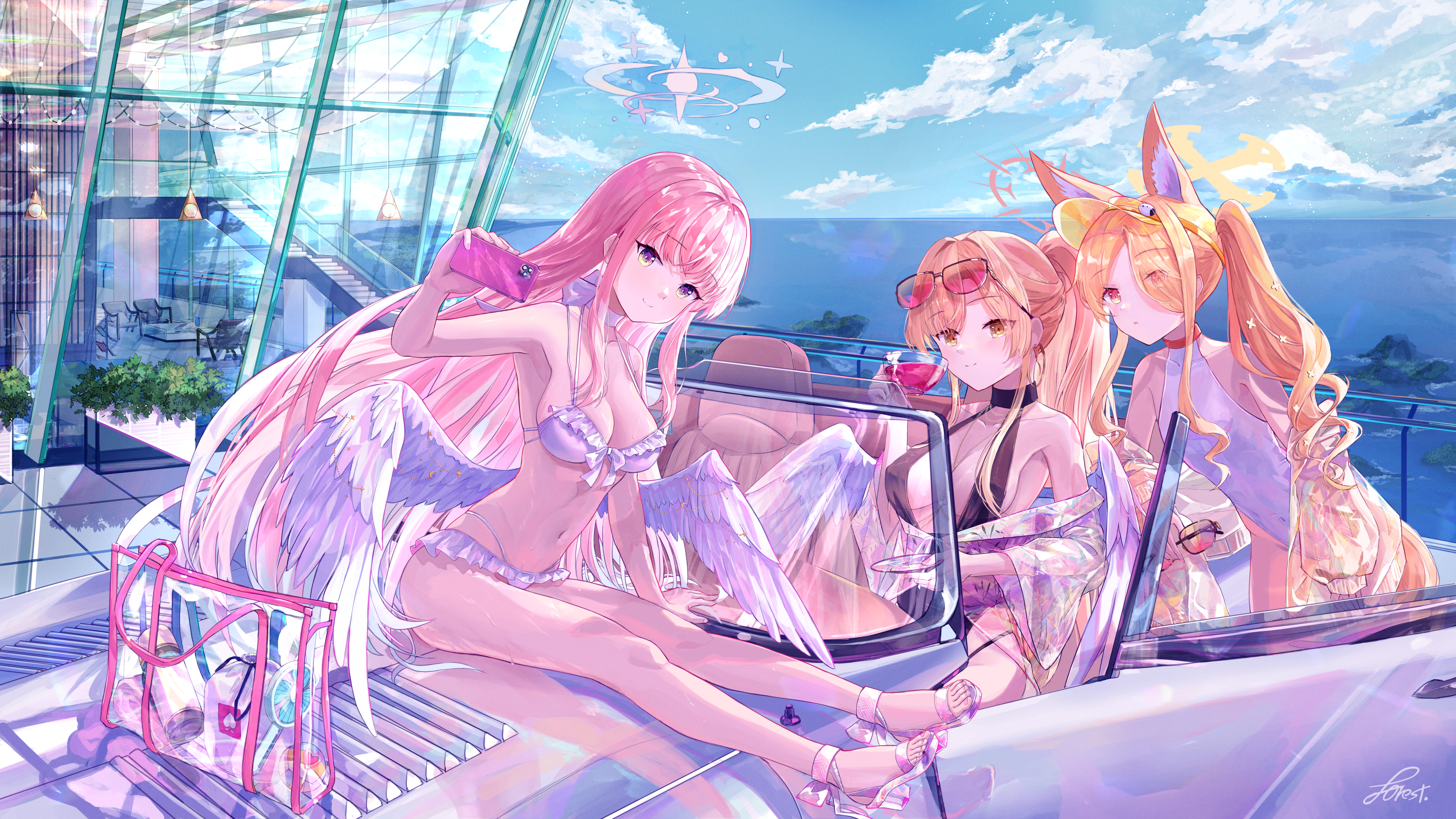 cyrene (honkai: star rail), honkai: star rail, honkai (series), commentary, highres, 1girl, bare shoulders, blue sky, breasts, coat, dress, hair ornament, hy acnth, jewelry, multicolored hair, necklace, outdoors, pink hair, purple coat, sky, small breasts, smile, solo, two-tone hair, upper body, wheat, wheat field, white dress, white hair