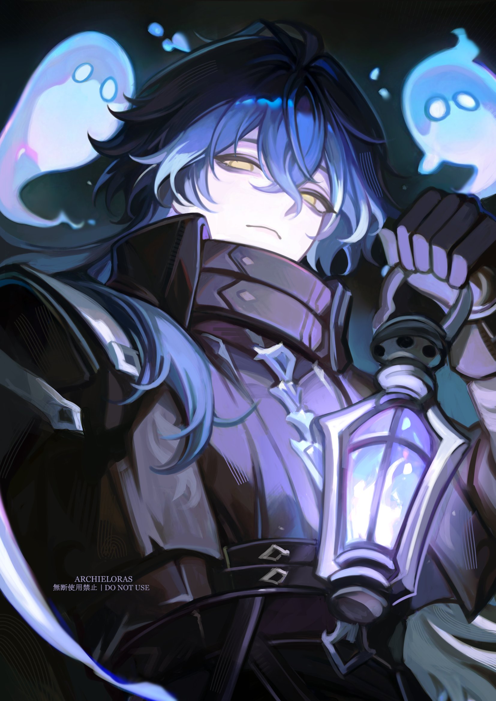 1boyantenna hairartist namebeltblack beltblack capeletblack coatblack glovesblue haircapeletclosed mouthcoatcollared capeletcrossed bangsfireghostglovesgradient hairhair between eyeshand upholdingholding lanternlanternlong hairlong sleeveslooking at viewermale focusmulticolored hairpurple firepurple shirtshirtsleeve cuffssolovery long hairwatermarkyellow eyes