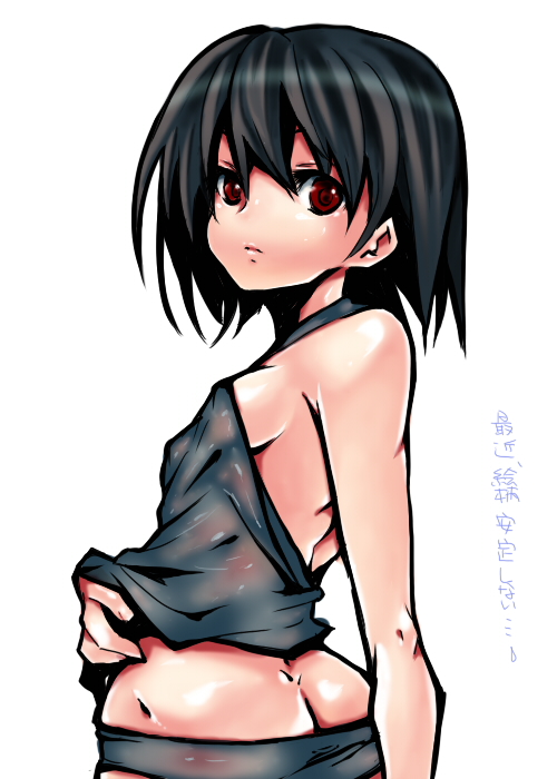 1girlassblack hairbreastsfemale focuslooking backpantiesred eyesshort hairsideboobsmall breastssolounderwear
