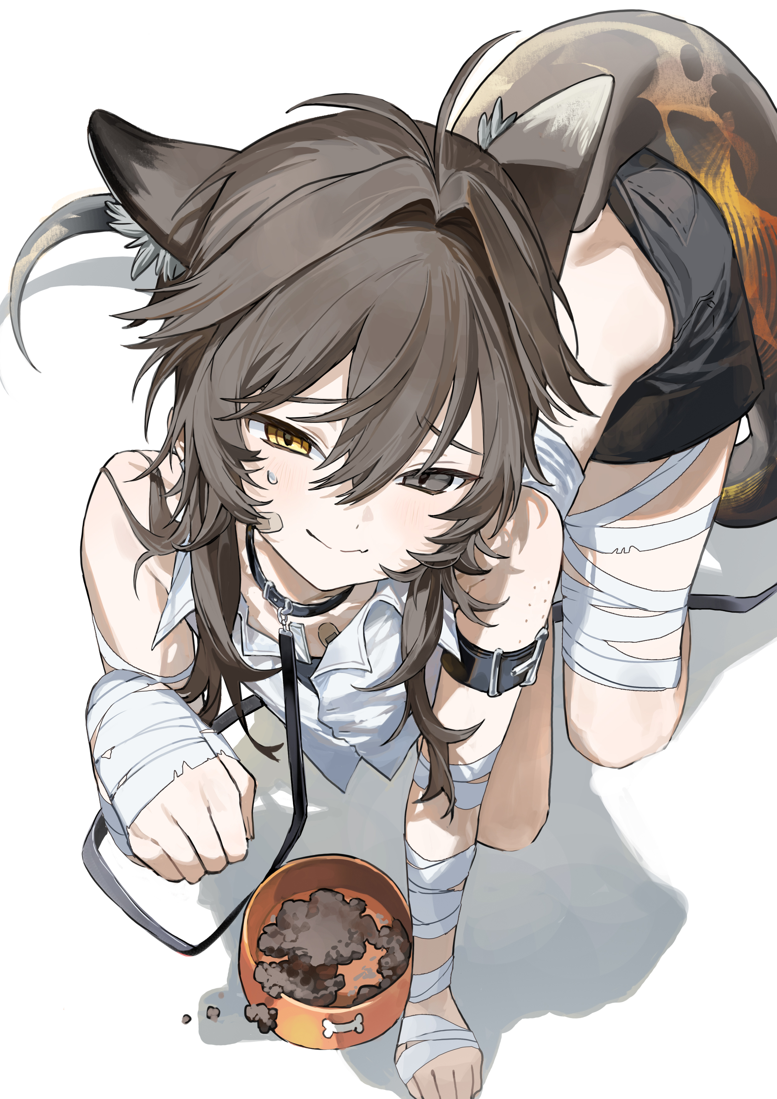 1boyanimal collaranimal ear fluffanimal earsarm beltbandaged armbandaged handbandaged legbandagesbare shouldersbeltblack beltblack collarblack shortsbowlbrown haircollarcollared shirtdot nosedouble-parted bangsgrey hairhair between eyeshair intakesheterochromiakneelinglizard taillong hairlooking at viewermale focuspaw posepet bowlpet foodshirtshort shortsshortssimple backgroundsleevelesssleeveless shirtsmilesolosweatdroptailvaccine scarwhite backgroundwhite shirtyellow eyes