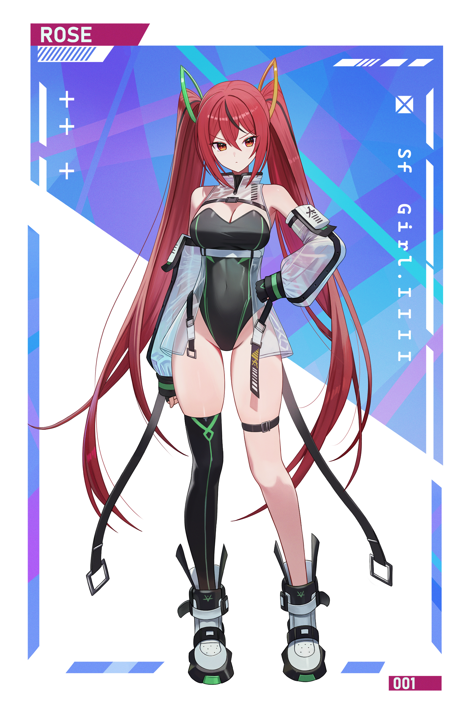 1girlbare shouldersblack glovesblack leotardblack streaksblack thighhighsbootsbreastscleavageclosed mouthcovered naveldetached sleevesfingerless glovesgloveshair between eyeshand on own hiplarge breastsleotardlong hairlooking at viewerpuffy sleevesred eyesred hairscience fictionsee-through clothessee-through shrugsee-through sleevesshrug (clothing)simple backgroundsingle thighhighskindentationsolostraplessstrapless leotardthigh strapthighhighsthighstwintailsvery long hairwaist capewhite boots