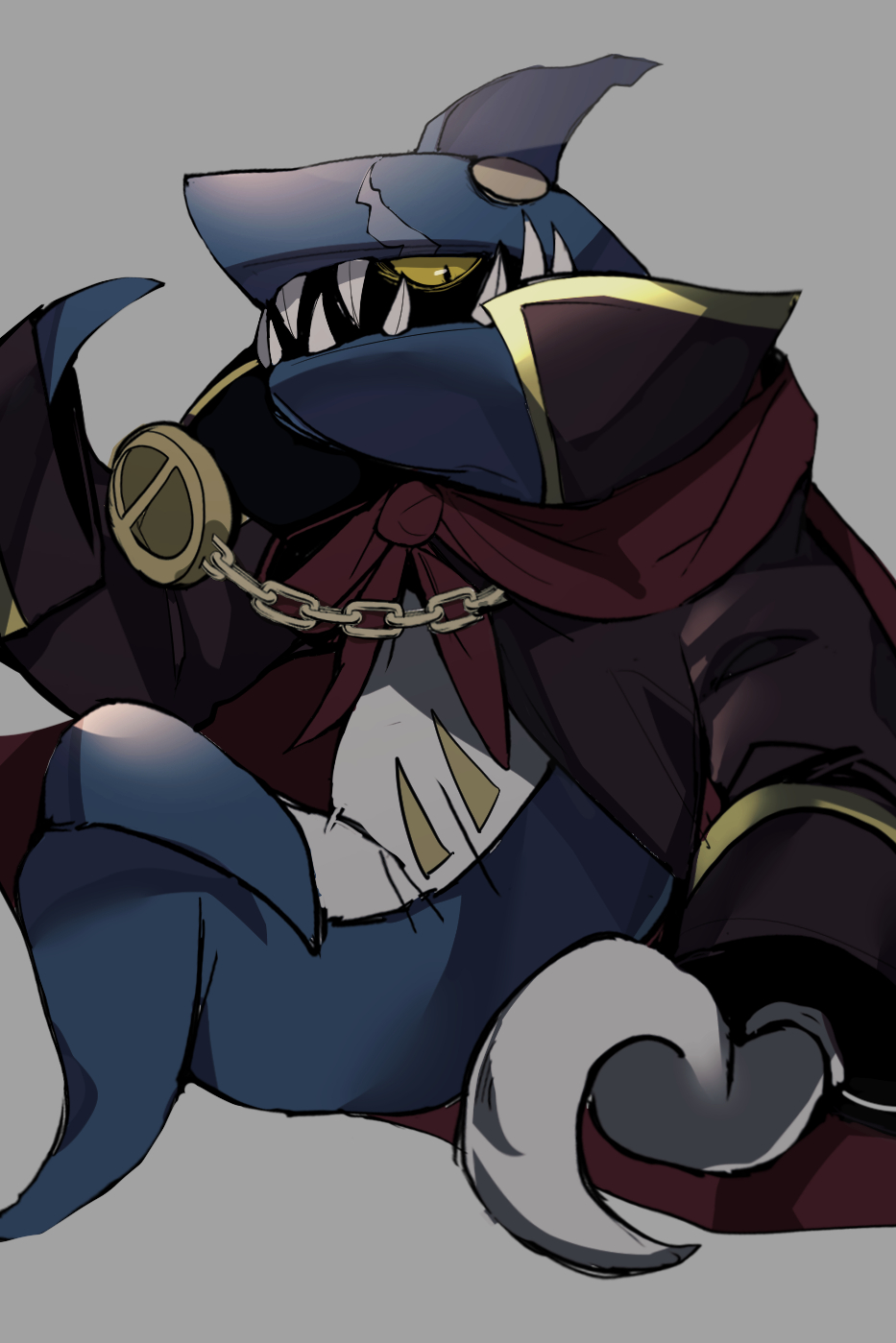 1boyblack eyesbody markingsbodysuitcapechaincolored scleracrossed legsfinsfish tailgrey backgroundhook handjacketlong sleeveslooking at viewermaskopen clothesopen jacketpirate costumescarscar on faceshaded facesharkshark tailsharp teethsimple backgroundsolotailteethyellow sclera