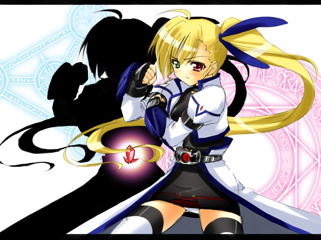 1girlbeltblonde hairblushfemale focusfingerless glovesglovesgreen eyeshair ribbonhenshin poseheterochromialetterboxedlong hairmagic circlepantiespantyshotparodyred eyesribbonside ponytailskirtsolothighhighsunderwearupskirtzettai ryouiki