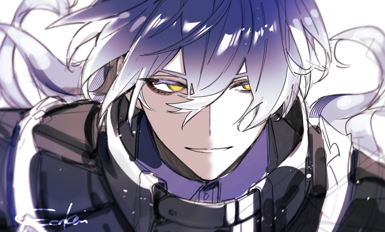 1boyblack jacketblue hairblue shirtcollared shirtdouble-parted bangsempty eyeseyelashesfloating hairgenkai ub3grinjacketlooking to the sidemale focusshirtsideways glancesignaturesketchsmilesoloteethupper bodywhite backgroundyellow eyes
