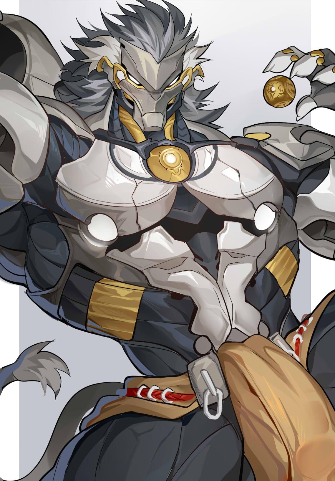 1boyarm upbanyue (zenless zone zero)baraclosed mouthgrey hairlong hairlooking at viewermale focusmuscularmuscular maleorbrobot boytail