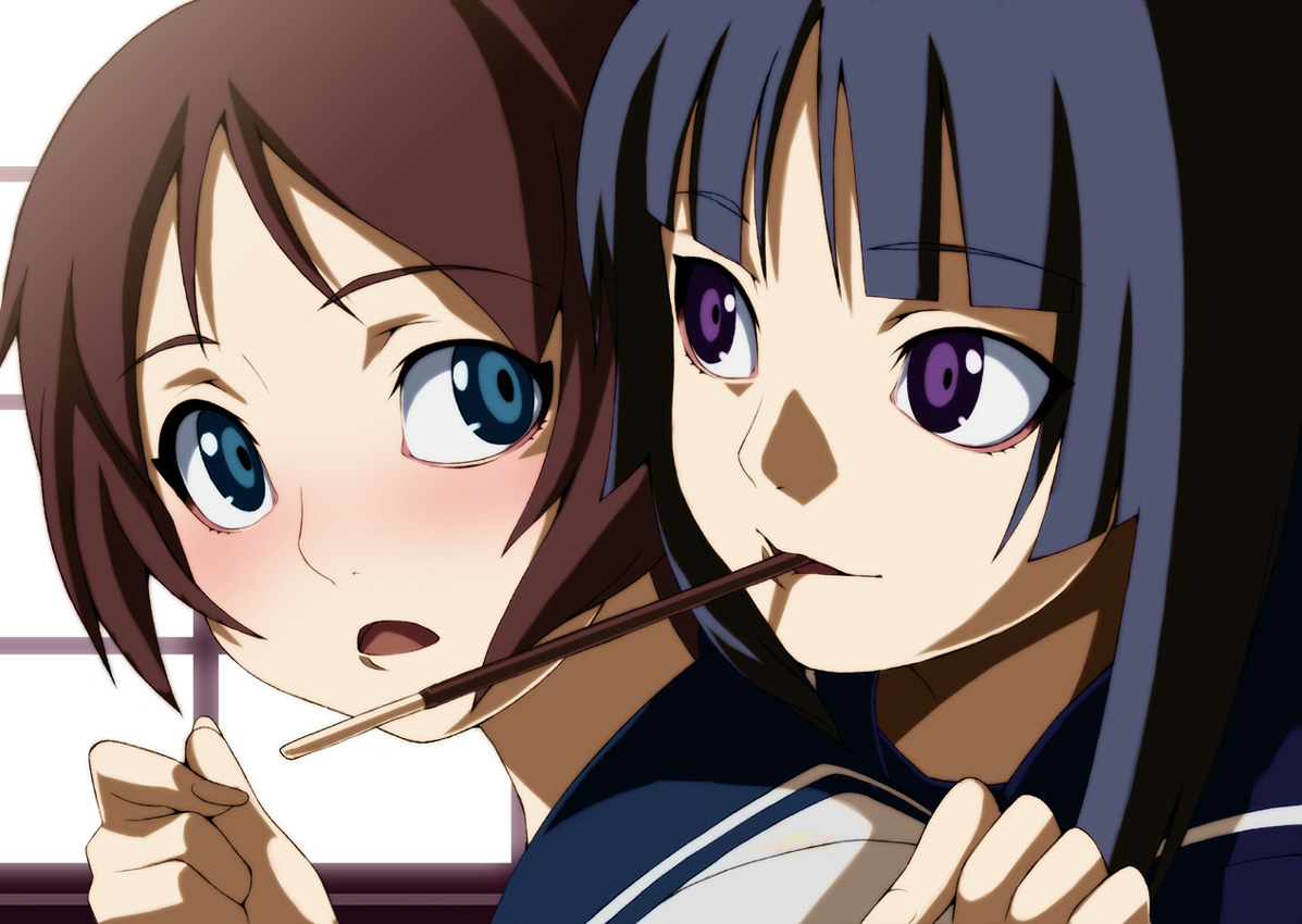 00s2girlsblue eyesblue hairblunt bangsblushbrown hairfoodhime cutmouth holdmultiple girlsopen mouthpockyportraitpurple eyesschool uniformyuri