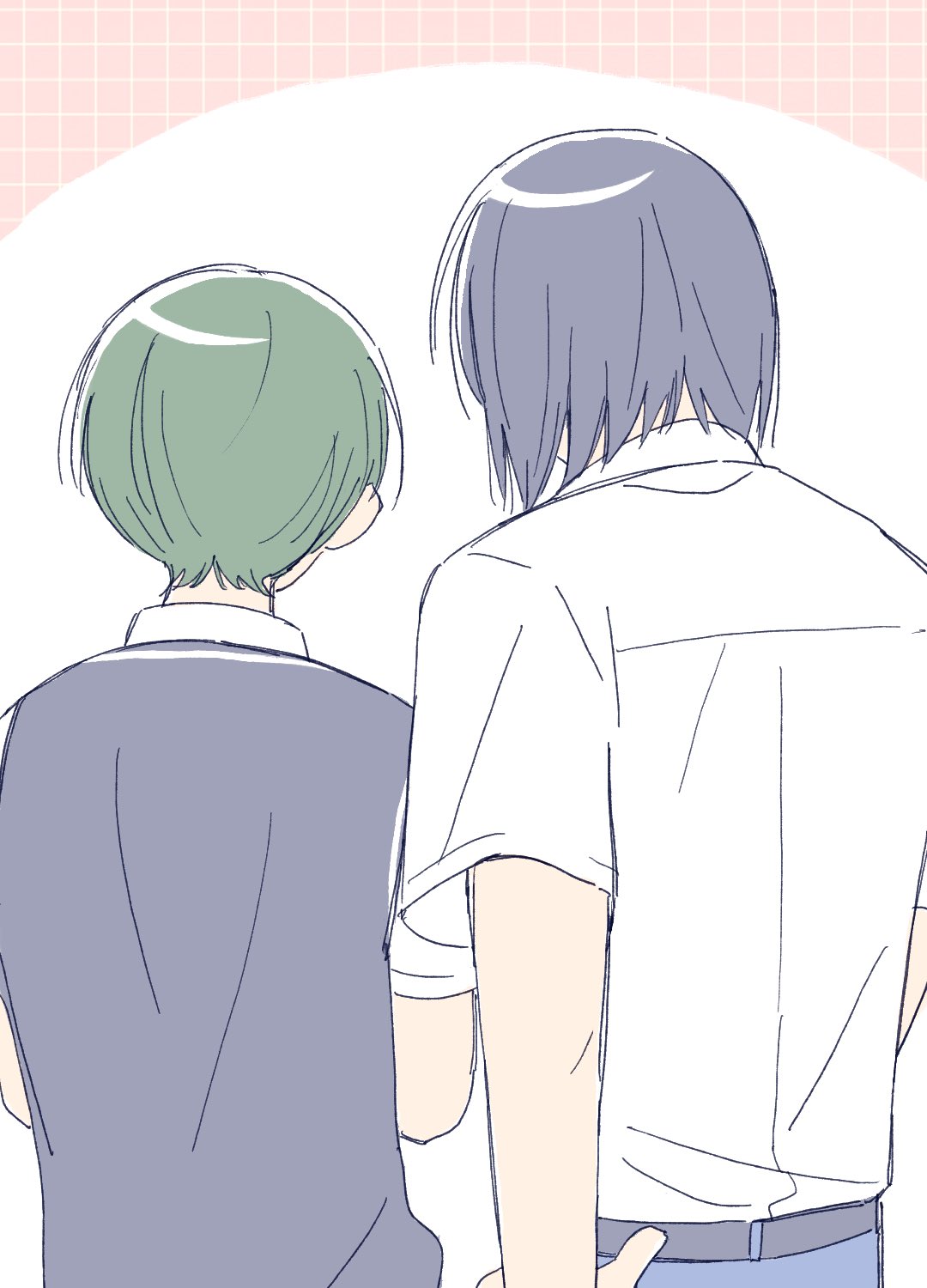 1boy1girlbeltblue pantscollared shirtcousinsfrom behindgreen hairgrey hairgrey sweatergrid backgroundpantsschool uniformshirtshirt tucked inshort sleevessweaterupper bodywhite backgroundwhite shirt