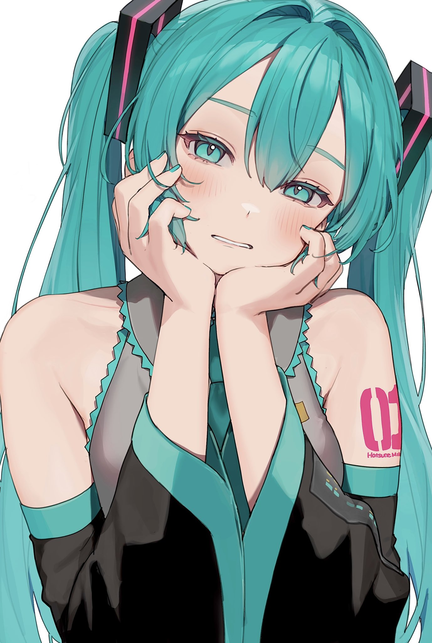 1girlaqua eyesaqua hairaqua nailsaqua necktieaqua trimarm tattoobare shouldersblushcollared shirtdetached sleevesgrey shirthair between eyeshair ornamenthands on own cheekshands on own facehead tiltlong hairlong sleeveslooking at viewernail polishnecktienumber tattooparted lipsshirtsimple backgroundsleevelesssleeveless shirtsolotattootwintailsupper bodyvery long hairwhite backgroundwide sleeves