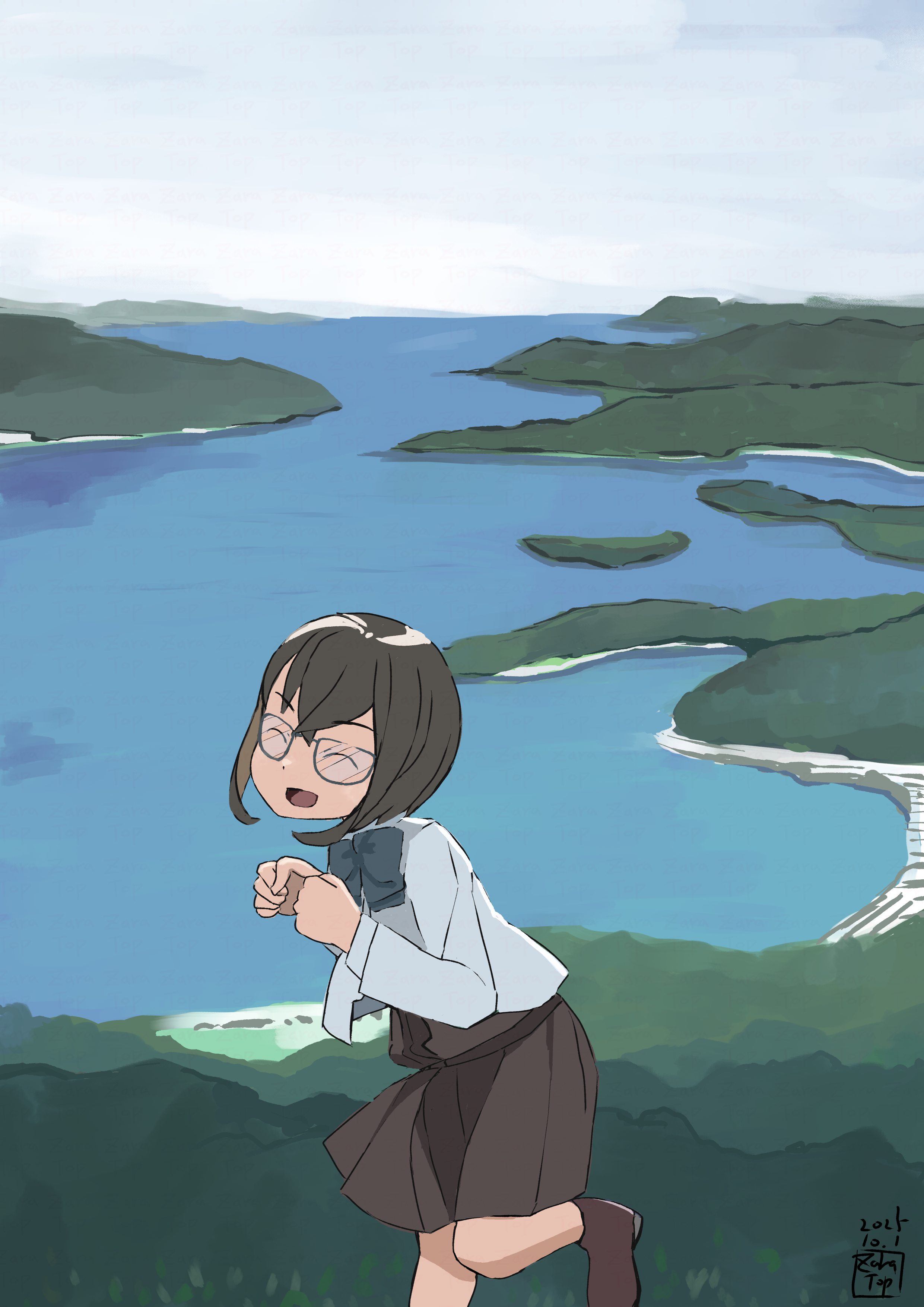 1girlblack bowblack bowtieblue skybowbowtiebrown dressclosed eyescloudcollared shirtdaydressdress shirtglasseshalter dresshalterneckhorizonone-hour drawing challengeoutdoorsshirtshort hairskysmilesolowhite shirt