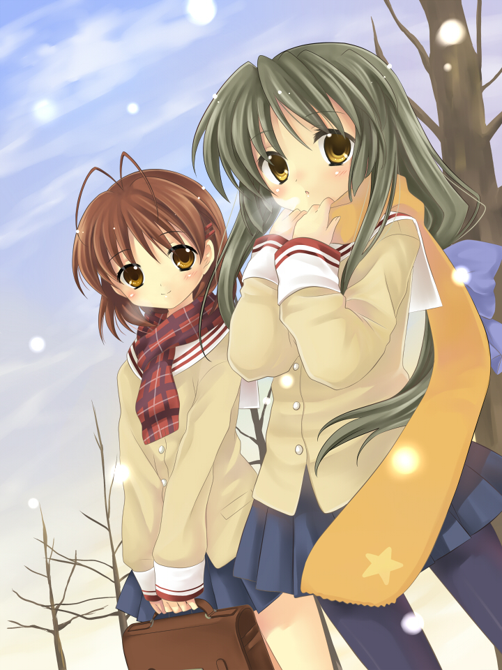 00s2girlsantenna hairbagbreathbrown eyesbrown hairgreen hairlong hairlooking at viewermultiple girlsoutdoorspantyhosescarfschool bagschool uniformshort hairsmilesnowstandingv armswinteryellow eyes