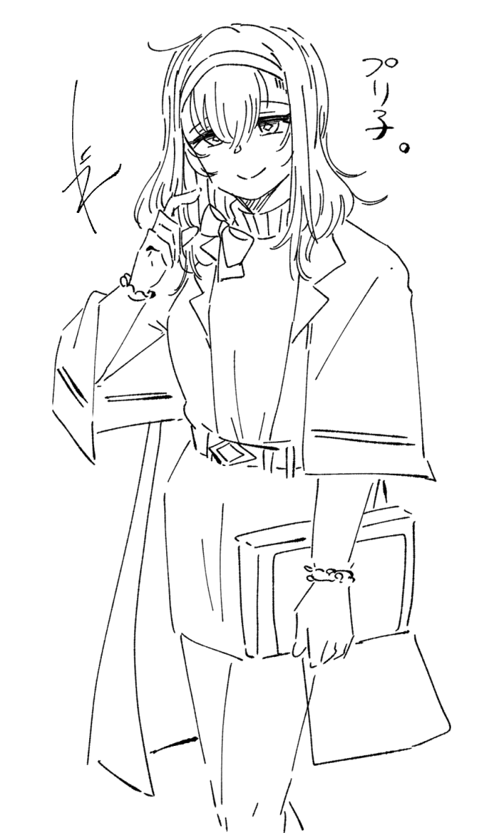 1girlbeltdiamond (shape)diamond-shaped pupilsgreyscalehairbandholdingholding paperlineartlong hairlong sleeveslooking at viewermonochromepaperpointingpointing at viewersimple backgroundsketchsmilesolosymbol-shaped pupilsturtleneckwhite backgroundymnr