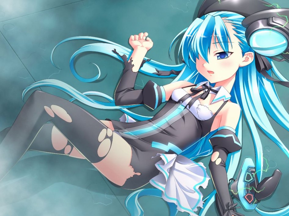 1girlaqua hairblue eyescontrollerdetached sleevesfemale focuslyingon backsolothighhighstorn clothestorn thighhighs