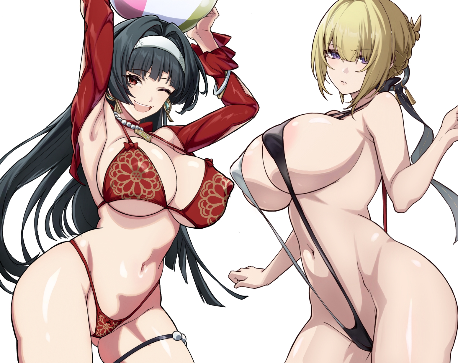 2girlsalternate breast size (larger)areola slipballbikiniblack bikiniblack hairblack slingshot swimsuitblonde hairblunt bangsbreastscleavageearringshair intakesholdingholding balljewelrylarge breastsmolemole under eyemultiple girlsone eye closedpurple eyesred bikinired eyessimple backgroundslingshot swimsuitswimsuitwhite background