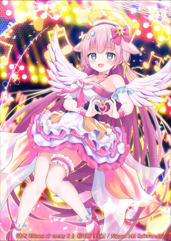 1girlbare shouldersbeamed eighth notesbeamed sixteenth notesblue eyesbowbreastsconcertconfetticopyright noticedressfeathered wingsfour-finger heart handsfrilled dressfrilled thigh strapfrillsglowstickhair bowhair ornamenthair ribbonhaloheartheart handsidol clotheslarge breastslong hairmarie (z/x)musical noteopen mouthpink bowpink hairpink shoesribbonshoessolostage lightsthigh straptraditional halovery long hairwingsyellow ribbon