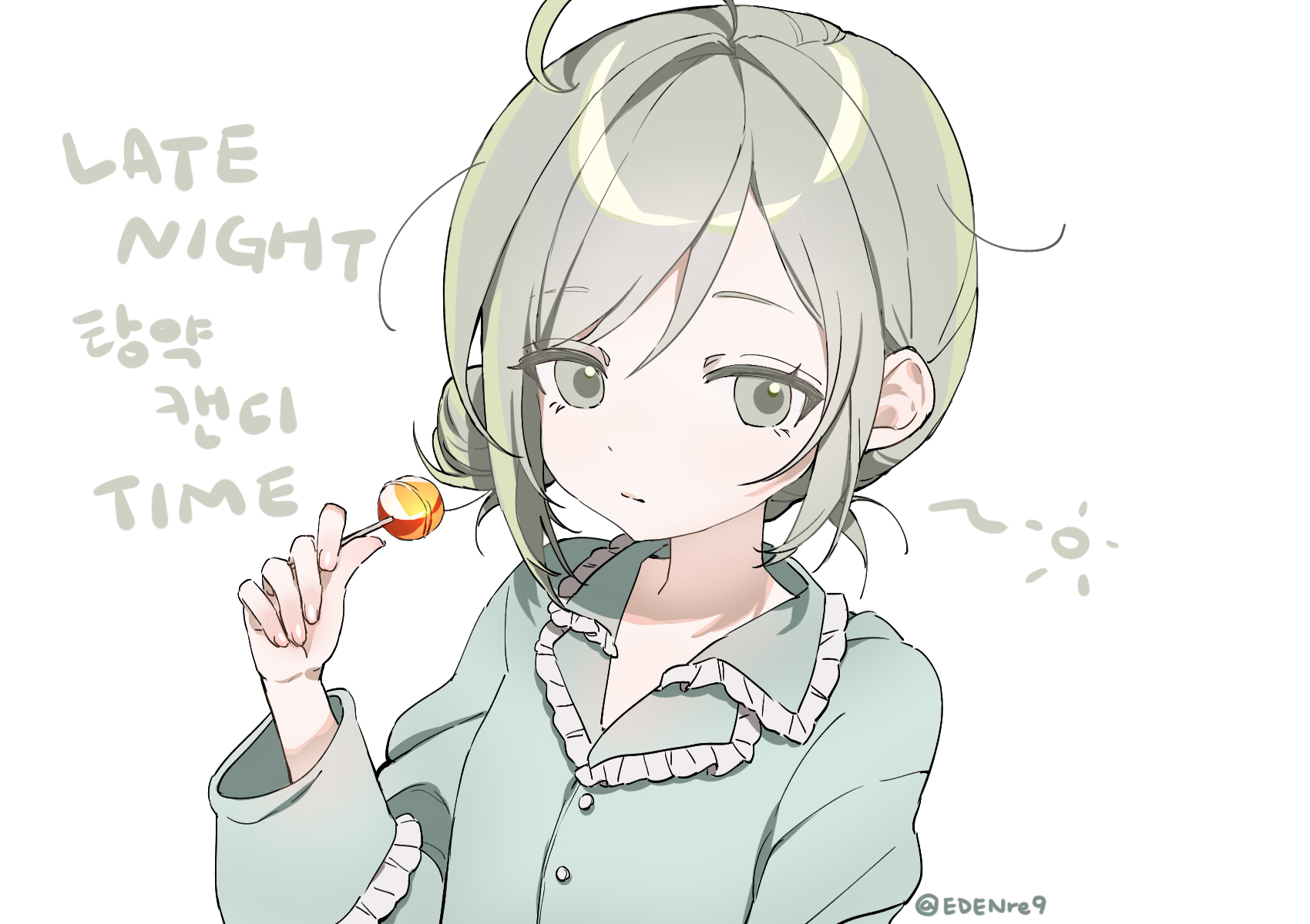 1boy1girlalternate costumeaqua pajamascandyeden (edenre9)foodgrey eyesgrey hairhair bunholdingholding candyholding foodholding lollipopkorean textlollipoplooking at viewerpajamasshort hairsingle side bunsolosqueansupper bodywhite background