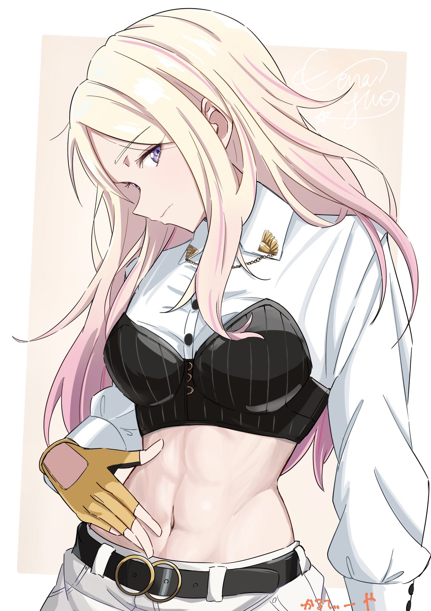 1girlabsarm at sideartist namebeltblack beltblonde hairborderbreastsbrown backgroundbuttonscharacter namecollared shirtcrop topfingerless glovesflour claviculeglovesgradient hairhand uplong hairlong sleeveslooking at viewerlooking to the sidemedium breastsmidriffmulticolored hairnavelo-ringo-ring beltoutside borderpantsparted bangspink hairprofileshirtsideways glancesimple backgroundsolostomachsymbol-shaped pupilstonedtoned femaletwo-tone hairupper bodywhite borderwhite pantswhite shirtyellow gloves
