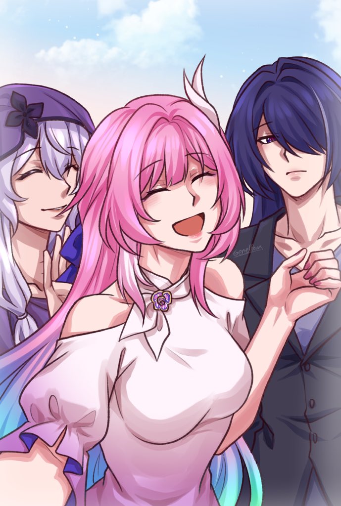 :d3girlsbreastsclosed eyesclothing cutoutcloudcloudy skydressflowerformal clothesfrilled sleevesfrillsgradient hairhair over one eyejeanelpantlight blushmulticolored hairmultiple girlsopen mouthpink hairpink nailspurple hairpurple veilselfieskysmilesuitupper bodyveilwhite dresswhite streaks