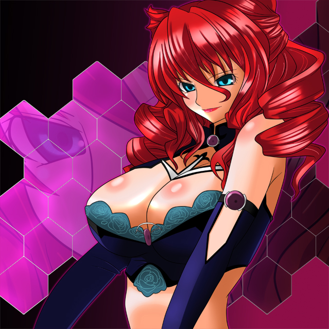 1girlblue eyesbreastscleavagedrill hairfemale focuslarge breastslipsticklong hairmakeupred hairseductive smilesmilesolo