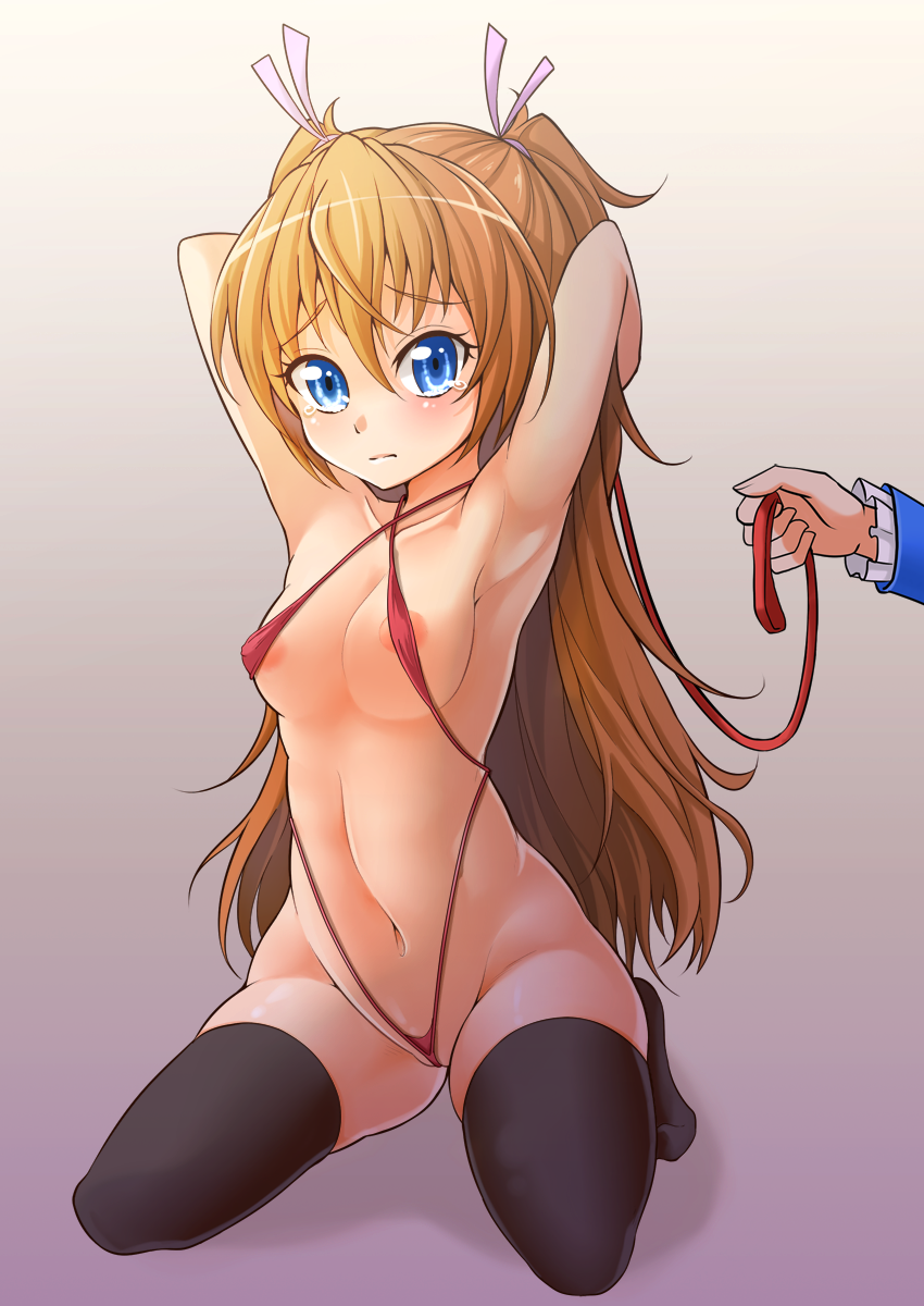bikiniblack legwearblue eyesdisembodied handfemaleFlag for Deletionleashlong hairorange hairsling bikinithighhighstied hairtwintails