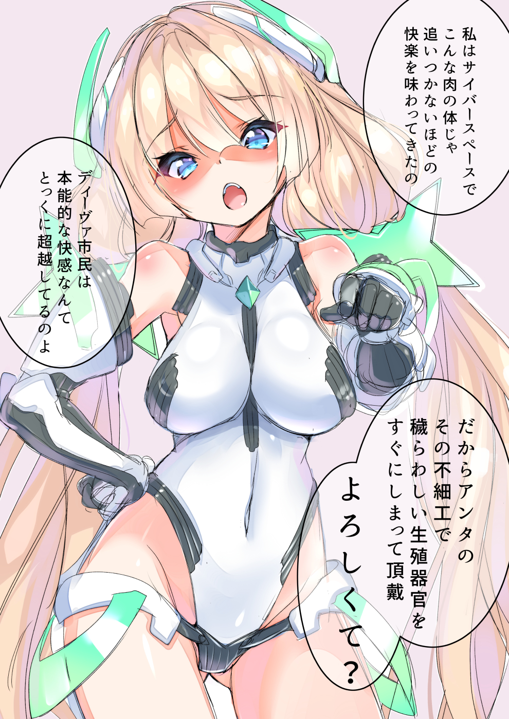 bare shouldersblonde hairblue eyesbodysuitbreastscovered navelelbow glovesfemaleFlag for Deletionglovesheadgearlarge breastsleotardlong hairlooking at viewerlow twintailsopen mouthpointingpointing at viewersolotied hairtwintailsvery long hair