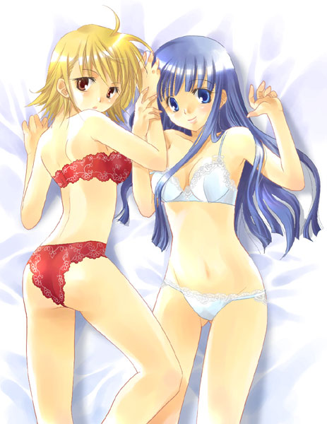 2girlsblonde hairblue eyesblue hairbrabrown eyeslingerielyingmultiple girlspantiesred pantiesunderwearunderwear onlywhite panties