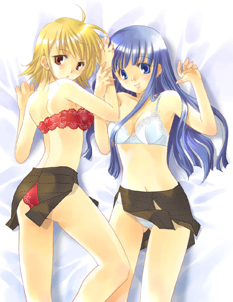 2girlsblonde hairblue eyesblue hairbrabrown eyeslingerielyingmultiple girlspantiesred pantiesskirtunderwearwhite panties