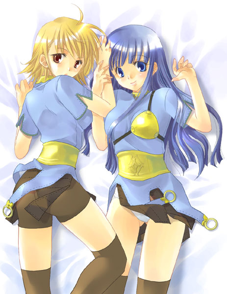 2girlsarmorbike shortsblonde hairblue eyesblue hairbreastplatebrown eyeslyingmultiple girlspantiesskirtthighhighsunderwearwhite panties
