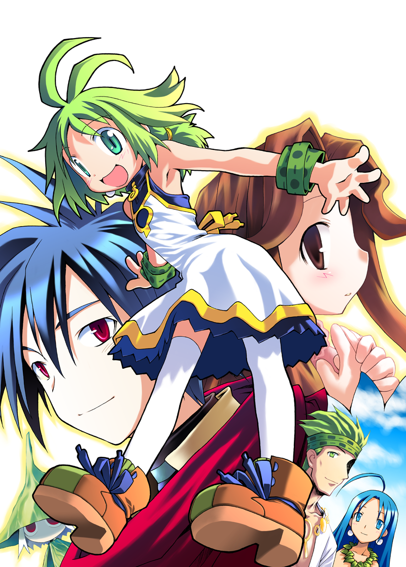 2boys3girlsantenna hairarmpitsbare shouldersblue hairblushbrown eyesbrown hairclosed mouthfull bodygreen eyesmultiple boysmultiple girlsred eyesshort hairsimple backgroundsmilethighhighswhite backgroundwrist cuffszettai ryouiki