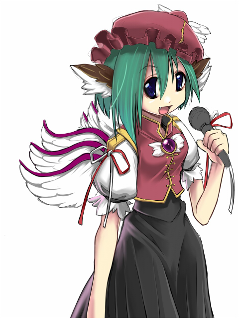 1girlblue eyesfangfemale focusgreen hairhatif they matedmicrophonesimple backgroundskirtsolowhite background