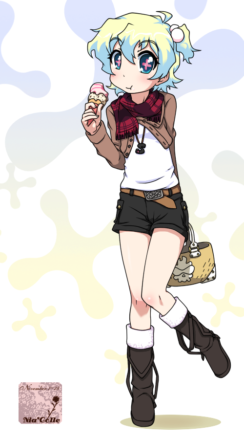 oso (toolate), amanita fuliginea, original, oso-teki kinoko gijinka zukan, 1girl, brown hair, female focus, headphones, midriff, mushroom, open clothes, open shirt, personification, red eyes, shirt, short hair, solo