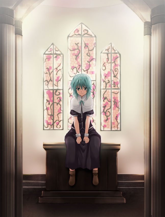 00s1girlblue eyesblue hairchurchdeskfemale focusmatching hair/eyesnunon deskshort hairsittingsolostained glasswindow