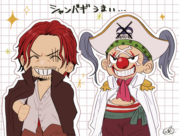 2boysbeard stubbleblack cloakblue haircloakepaulettesfacial hairhatmakeupmale focusmultiple boyspirate hatred hairred lipssashscarscar across eyescar on faceshirtshort hairsignaturesmilestubblewhite shirt