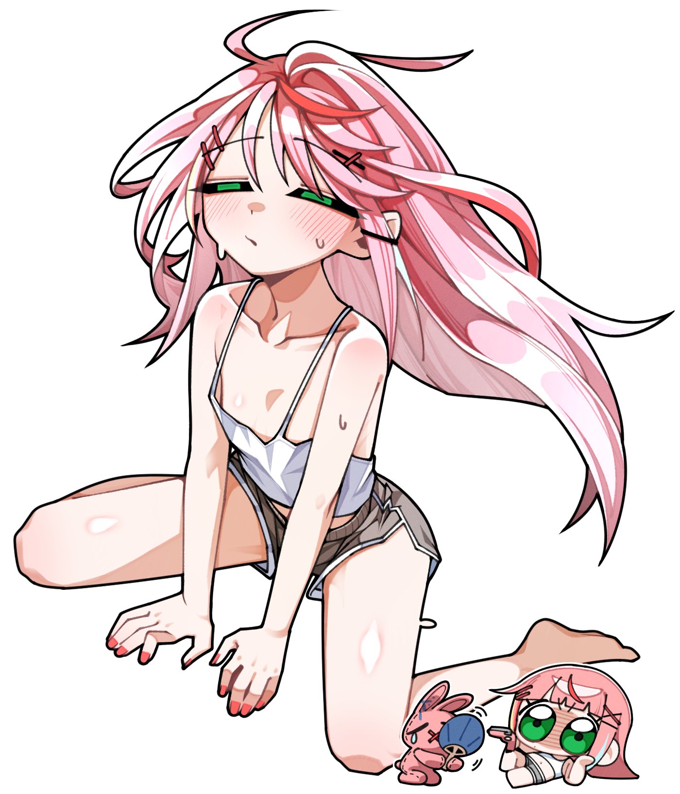 1girlbarefootbetween legsblushcamisoleclosed eyesclosed mouthcollarbonefingernailsflat chestfloating hairfull bodygrey shortshair ornamenthaircliphand between legshotlong hairnail polishno braparallel hairclipspink hairred nailssammi (33ammi)short shortsshortssidelockssimple backgroundsittingsolospread legssweatvirtual youtuberwhite backgroundwhite camisolex hair ornament