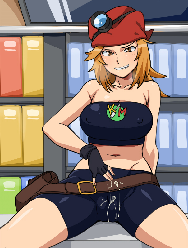 bandanabare shouldersbreastsbrown eyescameltoecleavagecumerect nipplesfemaleFlag for Deletionglovesgrinlarge breastslegslong hairlooking at viewernavelsittingsmilesolospread legs