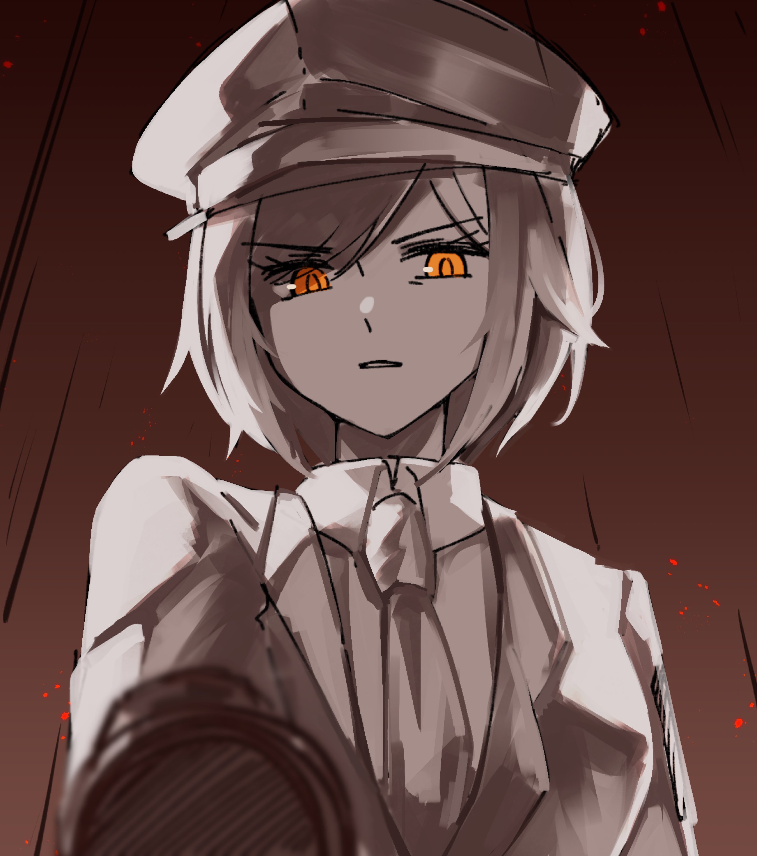 1girlbreastsformal clothesgunhair over one eyehatholdingholding gunholding weaponlooking at viewermilitary hatmilitary uniformmonochromenecktieorange eyespartially coloredshort hairsolosuitweapon
