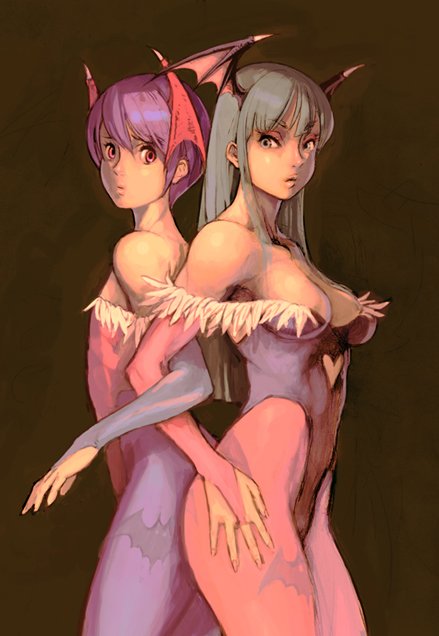 2girlsanimal printback-to-backbat printblack leotardbreastsbridal gauntletscleavagedemon girlflat chestgreen eyesgreen hairhead wingslarge breastsleotardlocked armsmultiple girlspantyhosepink pantyhosepurple hairpurple pantyhosered eyeswings