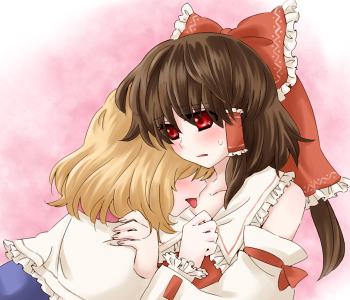 2girlsbare shouldersblonde hairblushbrown hairdetached sleevesfemale focushair over eyeshugjapanese clotheslickingmikomultiple girlsponytailred eyesshort hairshysweatdroptongueyuri