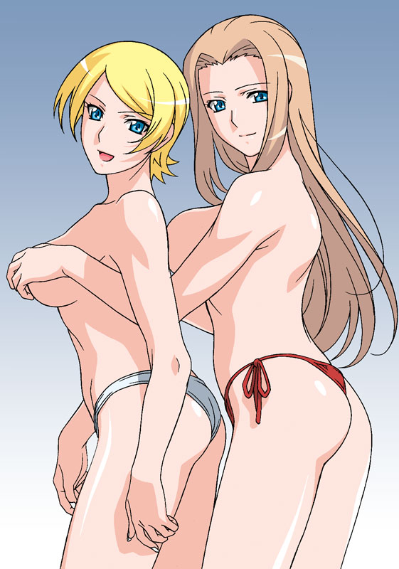 2girlsassbare shouldersbeachbikiniblue eyesbreastsfrom behindgrabbing another's breastgropinghappylarge breastsmultiple girlsopen mouthside-tie bikini bottomsideboobsmileswimsuittopfreedomtopless femaleyuri