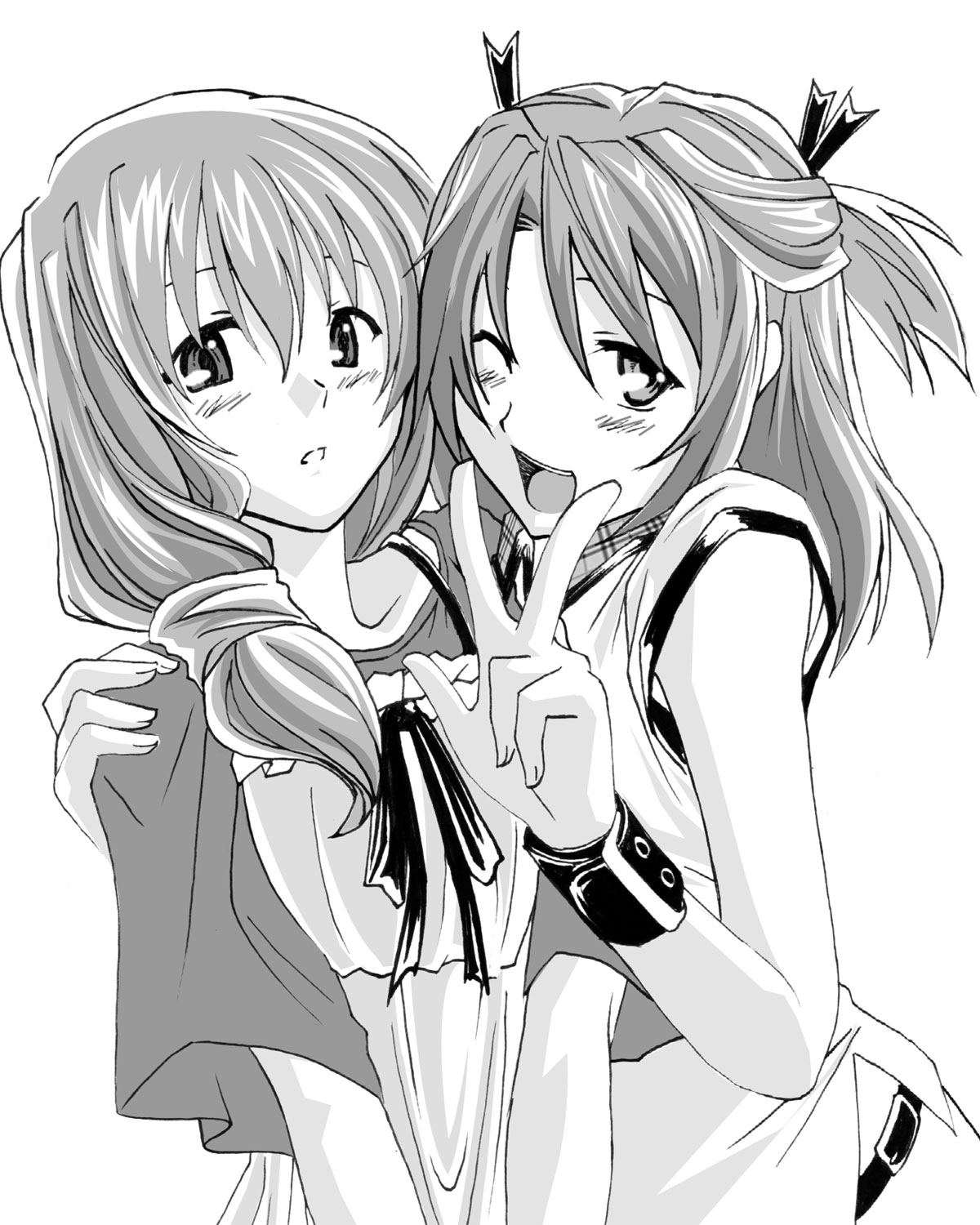 :d2girlsblushcollarbonefrowngreyscalehair over shoulderhuglooking at viewermonochromemultiple girlsopen mouthsailor collarschool uniformserafukusimple backgroundsmileupper bodywavy mouthwhite backgroundwrist cuffsyuri