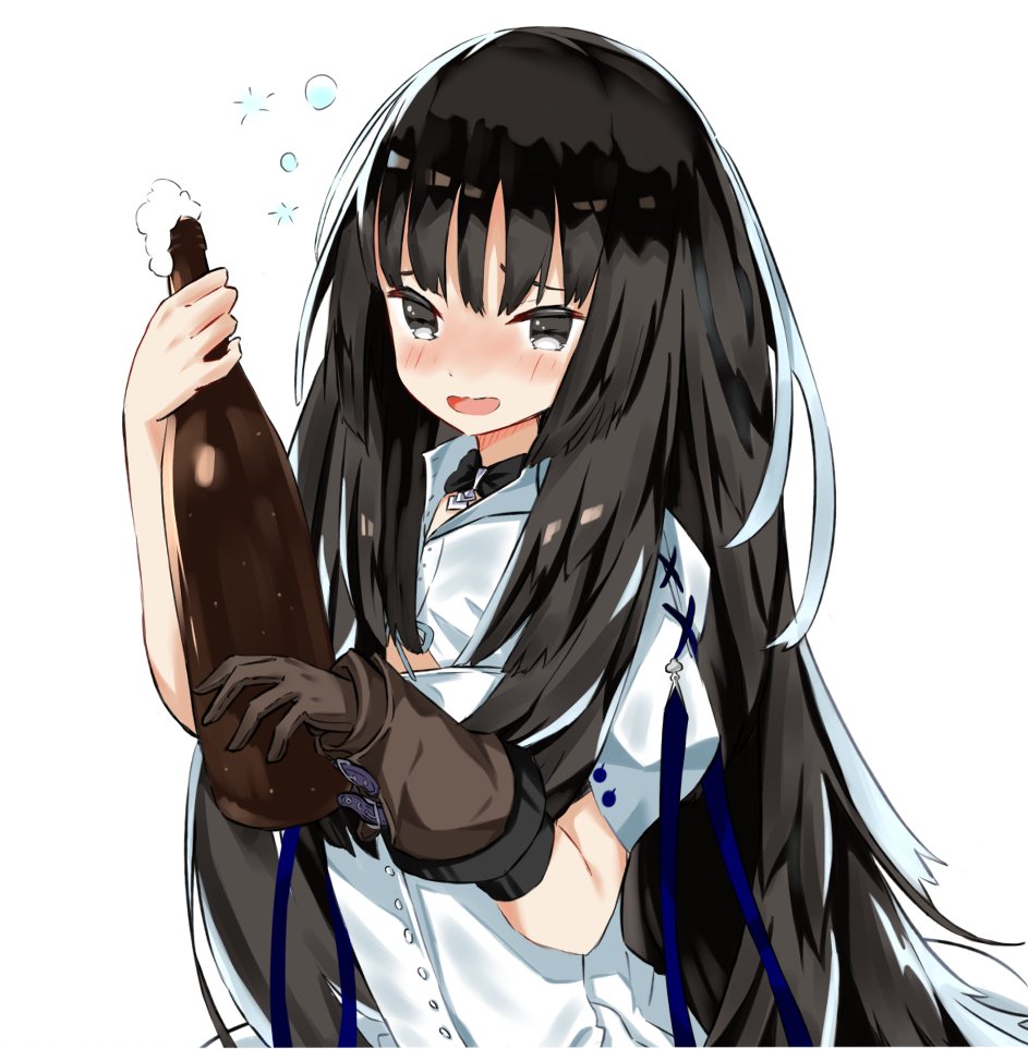 1girlaikawa yotakiblack eyesblack hairbottlebrown glovesdressdrunkglovesholdingholding bottlelong hairlooking at vieweropen mouthshort sleevessimple backgroundsingle glovesmilesolosqueansupper bodywhite backgroundwhite dress