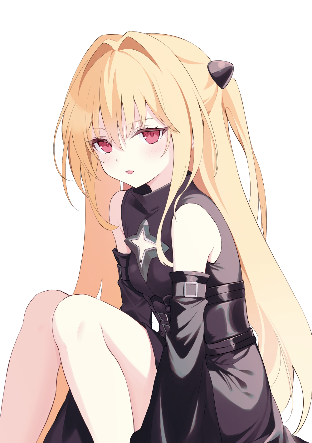 :d1girlbare shouldersblack dressblonde hairblushclothing cutoutdetached sleevesdresseyelashesfeet out of framehair between eyeshair intakesknees upleaning forwardlong hairlong sleeveslooking at vieweropen mouthred eyesrrinn zsidelockssimple backgroundsittingsleevelesssleeveless dresssmilesolostar cutoutstraight hairtsurimetwo side upvery long hairwhite backgroundwide sleeves