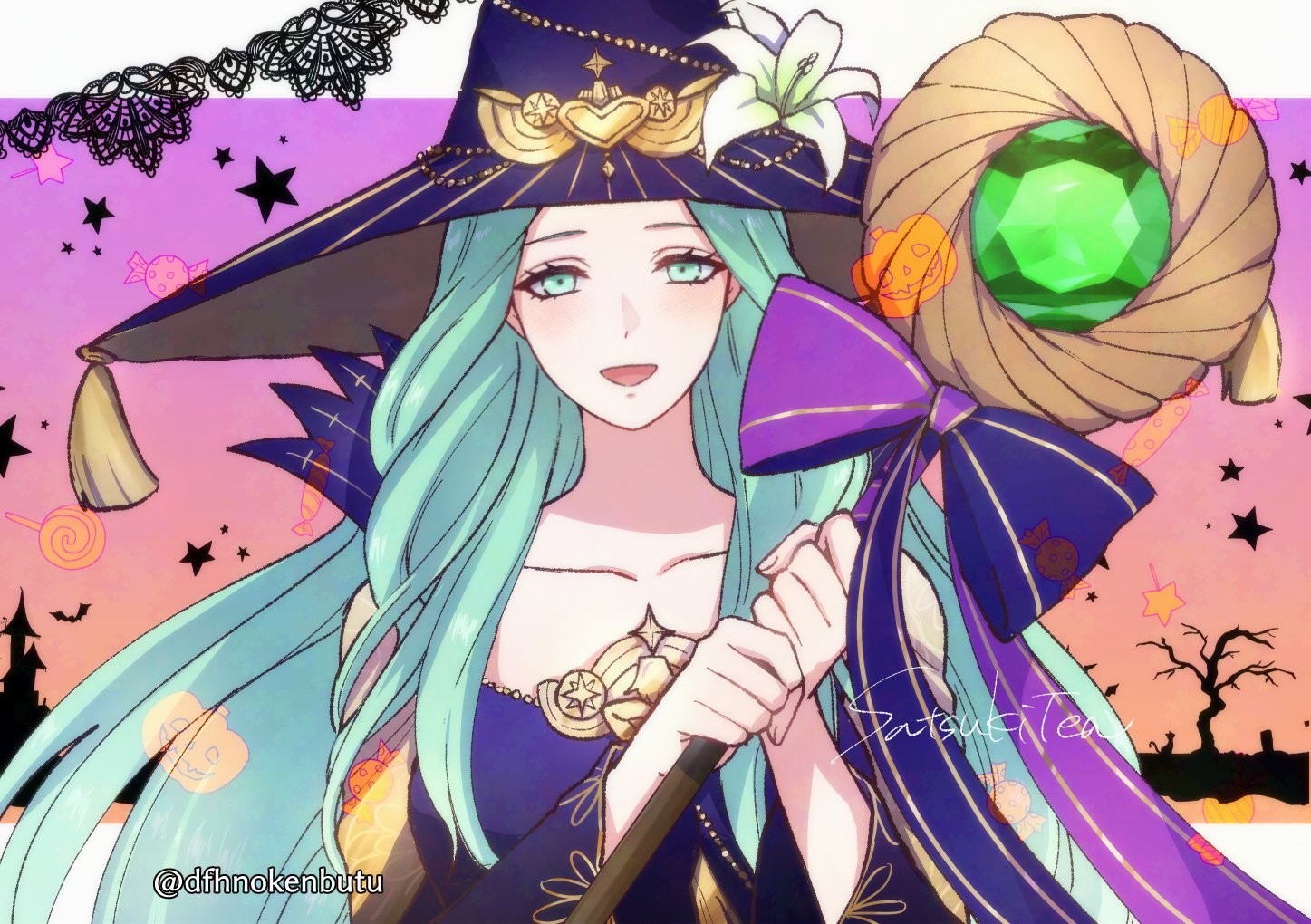 :d1girlbat (animal)breastscandycatcollarbonedressfoodgreen eyesgreen hairhatholdingholding stafflong hairlong sleevesmedium breastsofficial alternate costumeopen mouthpurple dresspurple hatsmilesolostaffstar (symbol)twitter usernameupper bodyvery long hairwitch hat