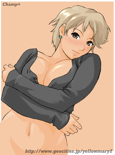 morisobo, arato nagi, ruri no houseki, commentary request, highres, 1girl, belt, black hair, blue pants, breasts, brown belt, closed mouth, collared shirt, head out of frame, large breasts, long hair, nipples, open clothes, open shirt, pants, shirt, simple background, sitting, smile, solo, sweat, white background, white shirt
