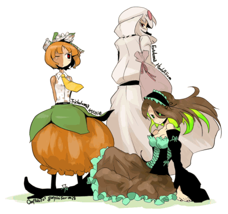 3girlsbare shouldersbeltblack nailsbootsbreastsbrown haircleavagedetached sleevesdressgreen eyesgreen hairhair over one eyehatlong hairmedium breastsmultiple girlsmushroomnail polishnecktieorange hairpersonificationred eyesshort hairskirtsleevelessthighhighswhite hair