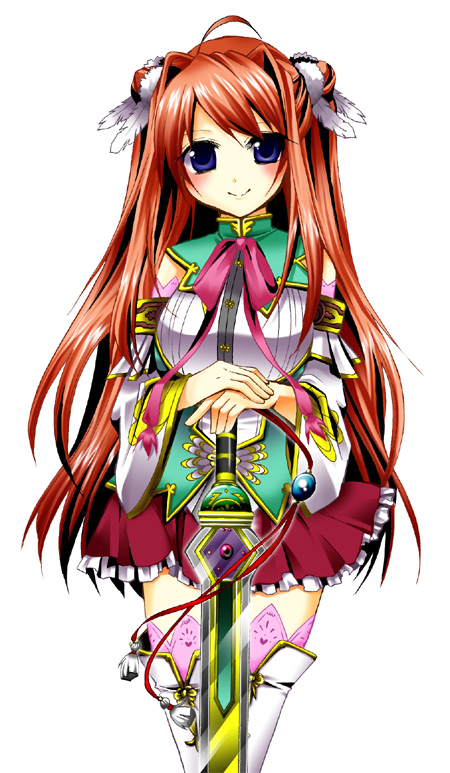 00s1girlahogeblue eyesblushdetached sleevesfeathersfemale focushands on hiltlong hairorange hairskirtsmilesoloswordthighhighsturtleneckvery long hairweaponzettai ryouiki