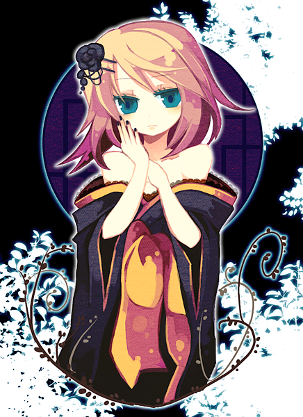1girlbare shouldersblonde hairblue eyescolored eyelashesexpressionlesseyelashesfemale focushair ornamenthairclipjapanese clotheslooking at viewershort hairsolo