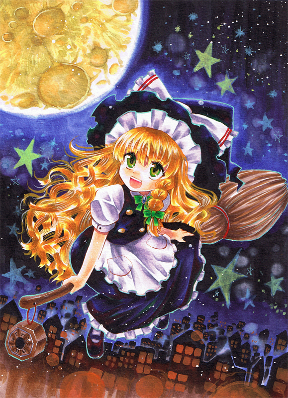 1girlblonde hairbroombroom ridingcityscapefemale focusfull moongreen eyeshatmini-hakkeromoonsidesaddlesolostar (symbol)witchwitch hat